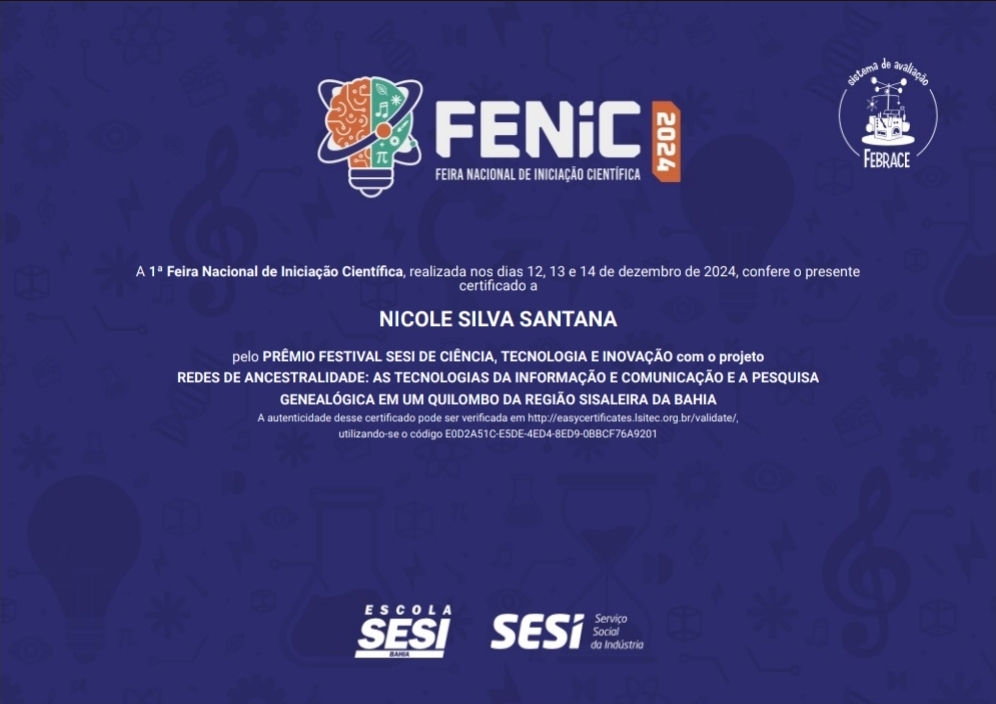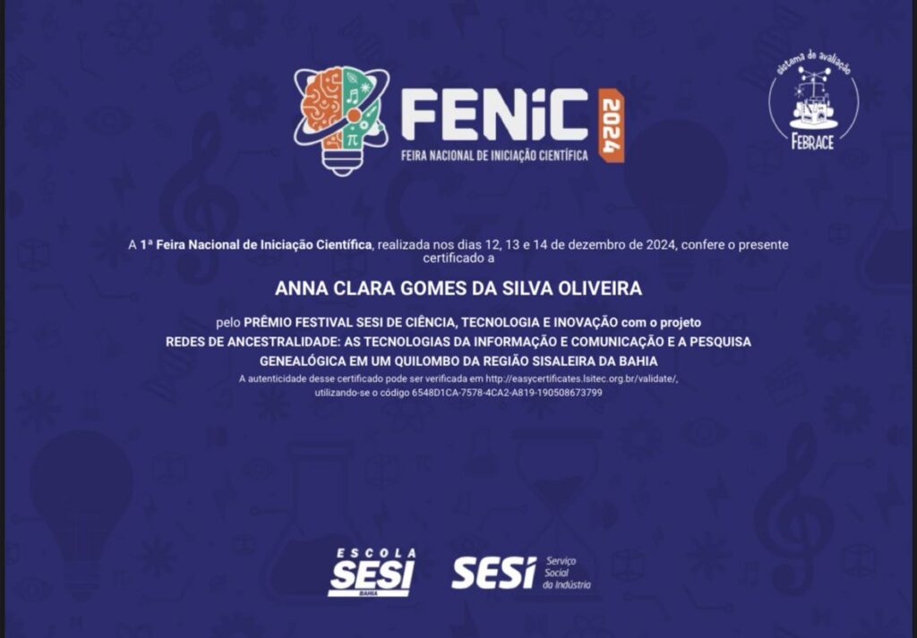 Em dezembro de 2024 participamos da 1ª edição da Feira Nacional de Iniciação Cientifica, em Salvador, ao qual o projeto recebeu a premiação de menção honrosa. Fomos os únicos da rede estadual da Bahia a ser premiados na feira, sem ser Centros Técnicos, o único grupo da cidade de Serrinha-Bahia.